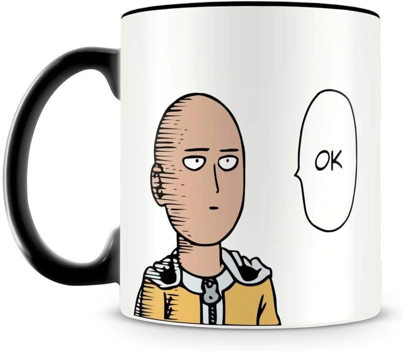 Caneca personalizada de porcelana de alto brilho interior e alça preta com estampa do anime One Punch Man.