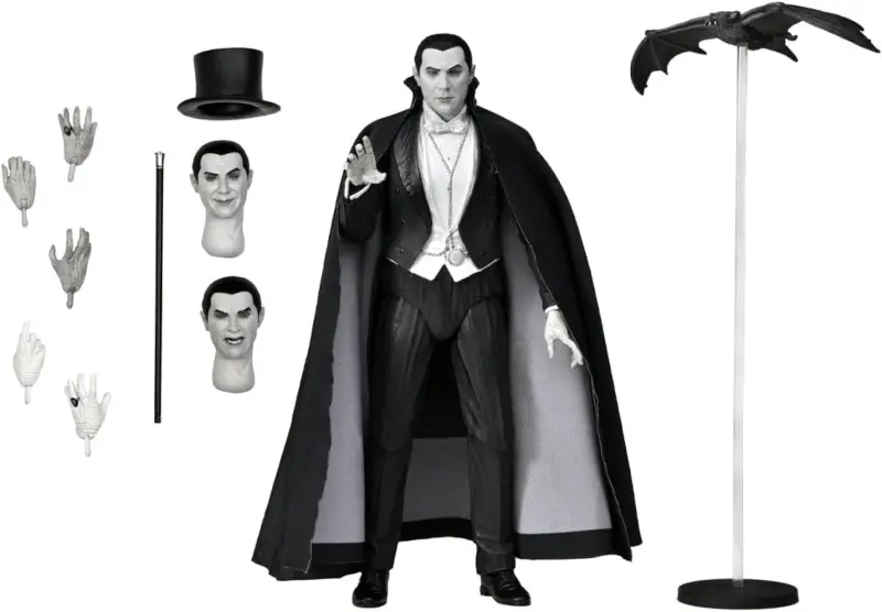 NECA announces a new Ultimate action figure of the most famous vampire of them all… Dracula! Following the color version, we’ve created a special black-and-white figure that features the formal tuxedo seen at his Carfax estate. We worked closely with the estate of Bela Lugosi to capture the actor’s expressive likeness and for additional background detail on important costume elements. Standing in 7” scale, the Ultimate Dracula (Carfax Abbey) action figure has a removable soft goods cape and comes with plenty of accessories: top hat, cane, bat, flight stand, plus three interchangeable heads and hands. Includes additional neck piece making it compatible with the heads from the color version. Display-friendly window box packaging with opening front flap.